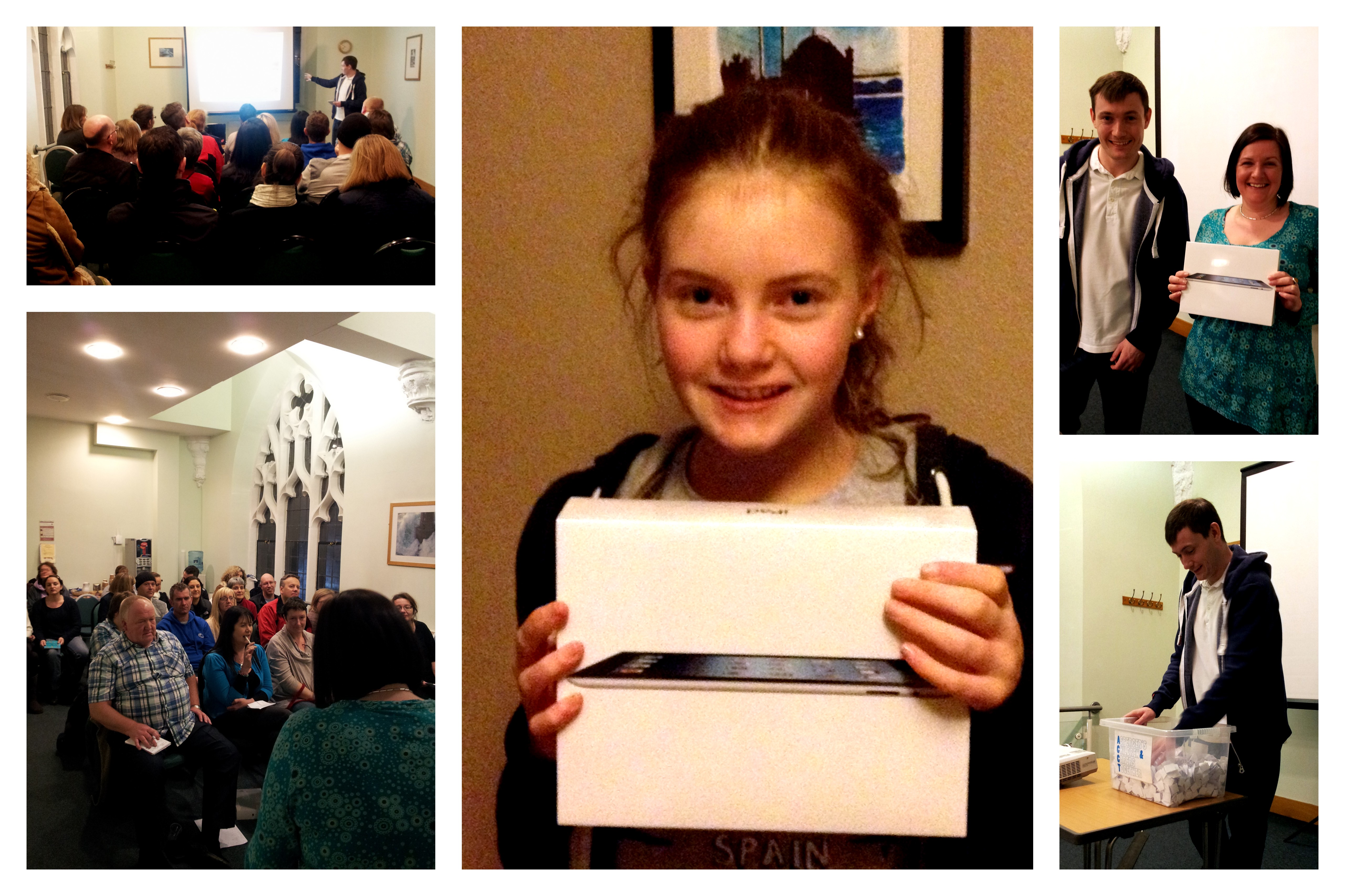 The Raffle Draw took place at our monthly parent’s meeting on January 10th 2013, thankyou to everyone involved in organising and everyone who bought a ticket. The winners were drawn by our guest speaker Ross Littlewood, (pictured above), who gave an excellent presentation about living with Asperger’s Syndrome. First prize, the Ipad was won by Charlotte Hampton (pictured above), daughter of Nicola Hough (pictured above with Ross Littlewood).